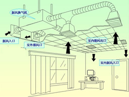 制冷制熱工作原理為:室外新鮮空氣經(jīng)新風(fēng)口進(jìn)入空氣處理室,經(jīng)過過濾器清除掉空調(diào)中的灰塵,再經(jīng)過表冷器、加熱器等設(shè)備的處理,使空氣達(dá)到設(shè)計要求的溫度和濕度后,由送風(fēng)機經(jīng)風(fēng)量控制系統(tǒng)送入風(fēng)管系統(tǒng)送入消聲裝置降低噪聲后,經(jīng)過各房間風(fēng)量調(diào)節(jié)裝置,由出風(fēng)口送到各空調(diào)房間,吸收了房間里的余熱、余濕后,自回風(fēng)口經(jīng)風(fēng)道排出室外。